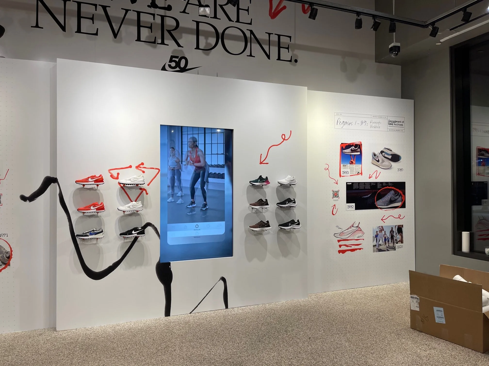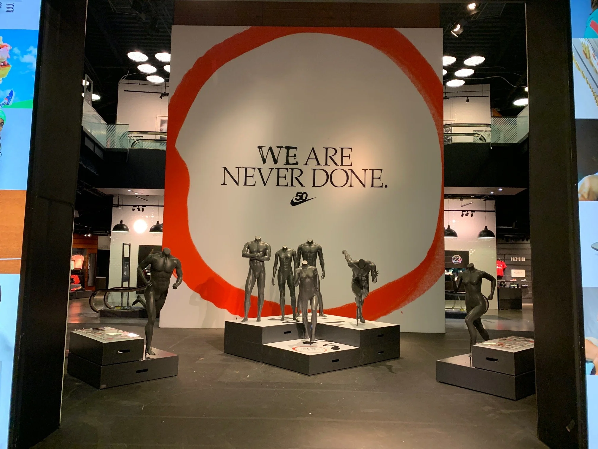 For its 50th anniversary Nike wanted to create a consumer experience across its flagship US market stores that told the story of Nike's history and expressed its relentless pursuit of high quality athletic apparel. For this project, I helped create large wall graphics, window takeovers, full zones of storytelling, mannequin displays, footwear displays, and product signage – all across 18 stores in the US market, to successfully tell a cohesive story of how Nike’s products had evolved over their 50 year history as a company.