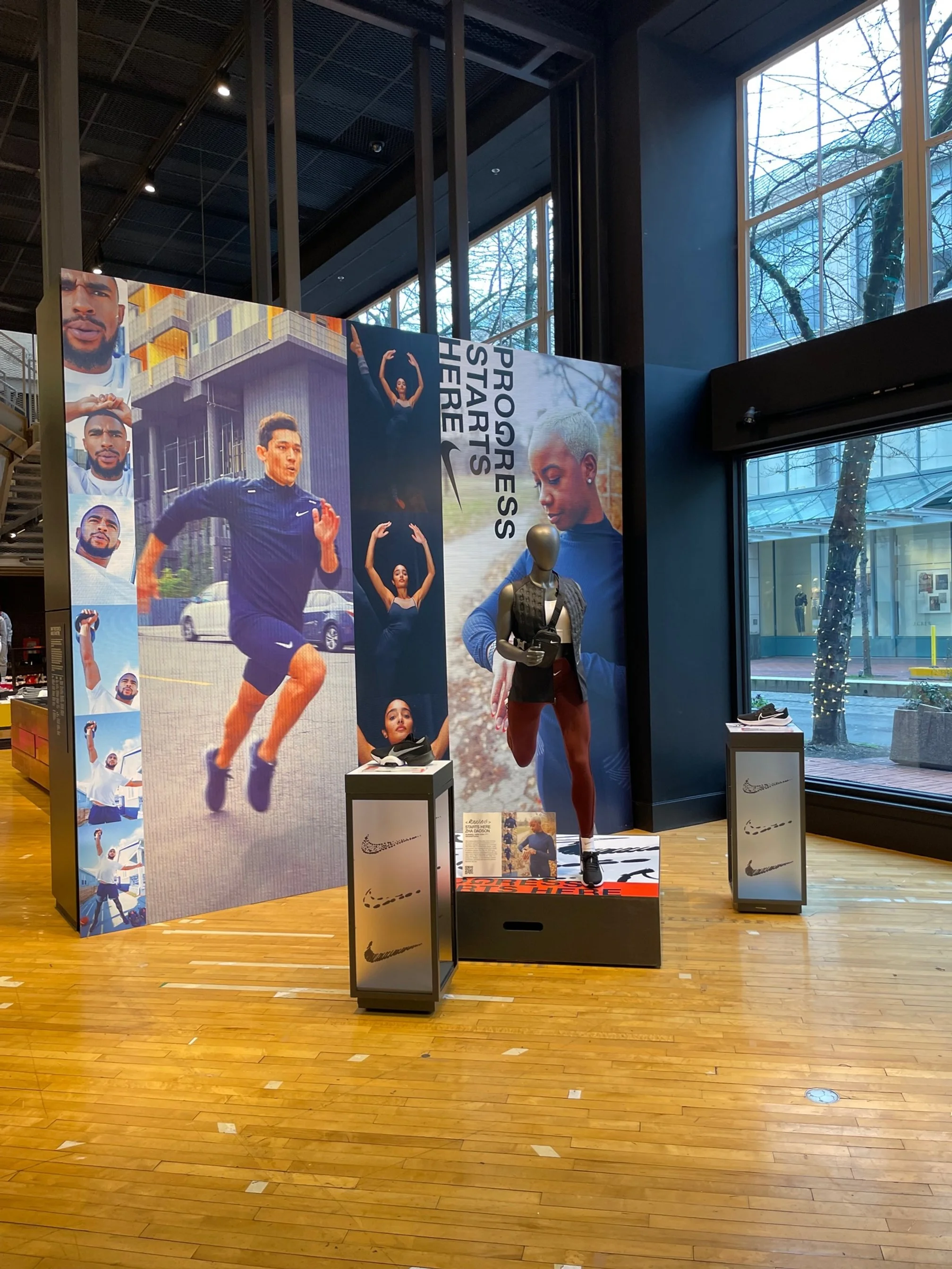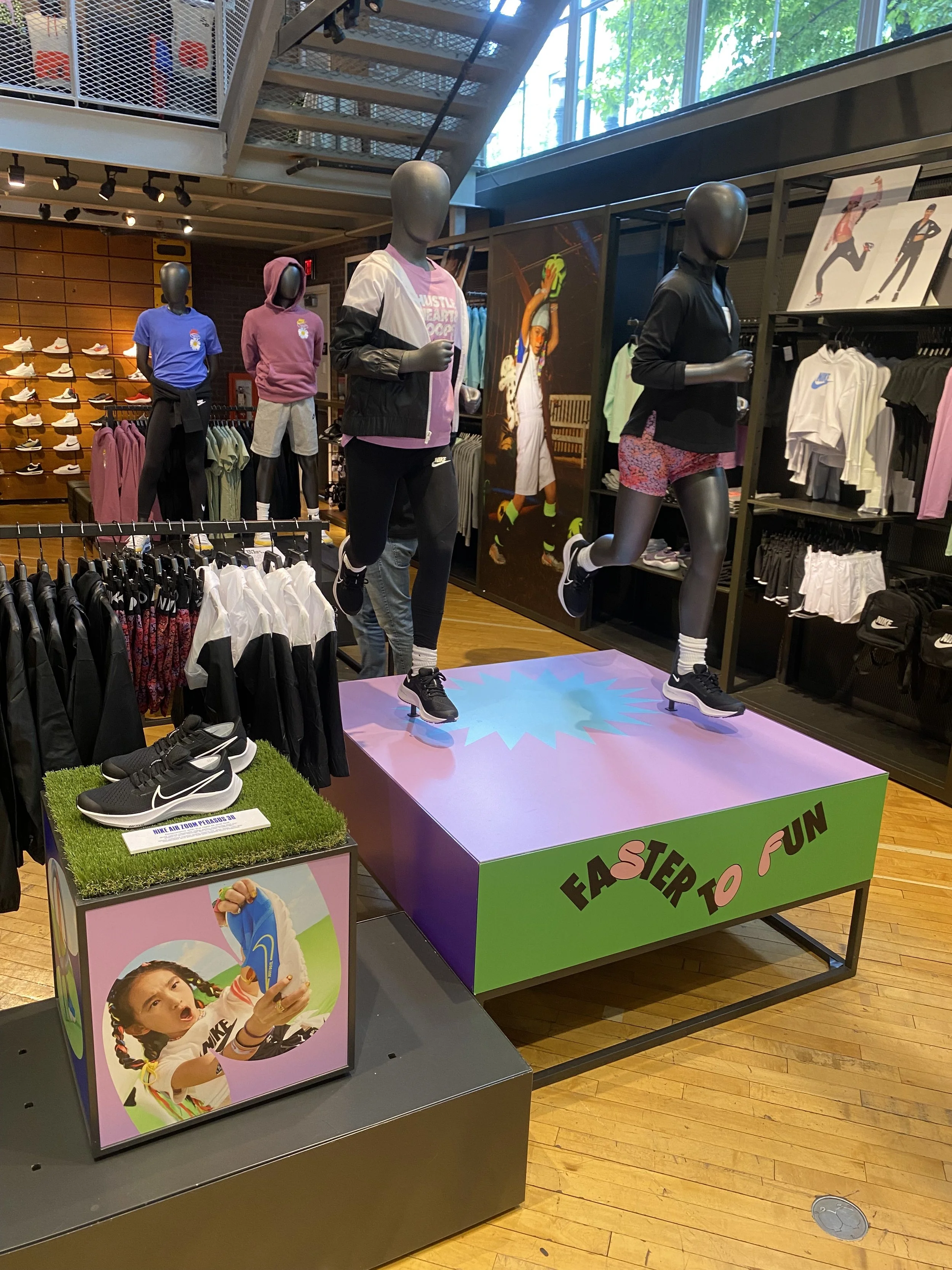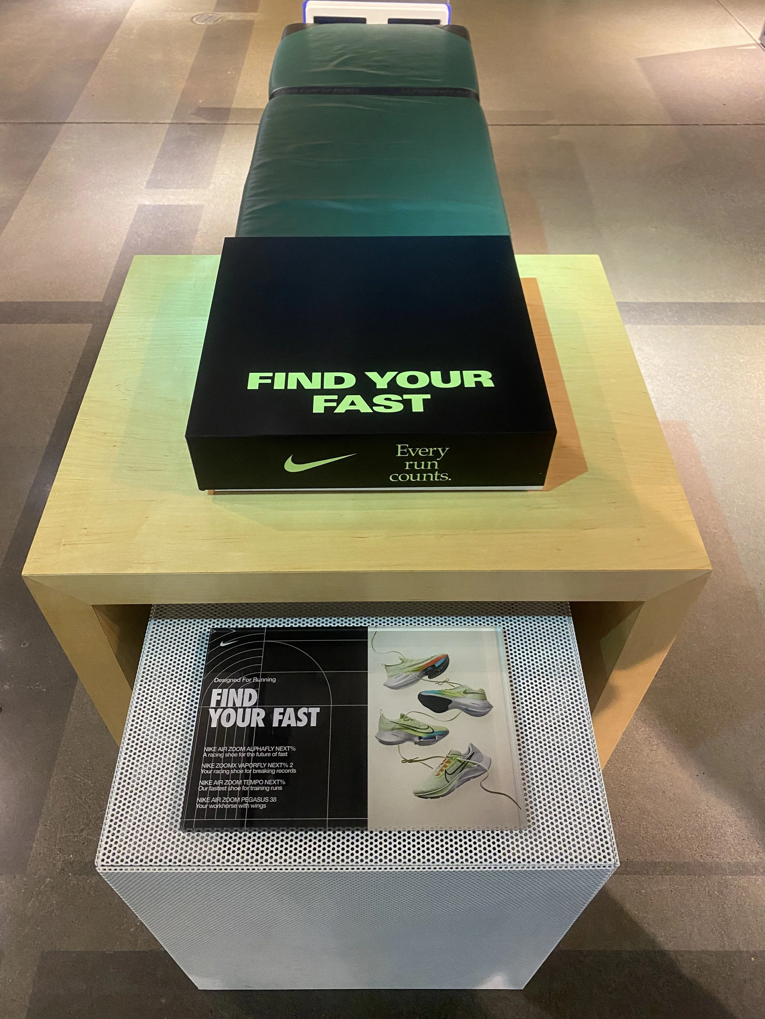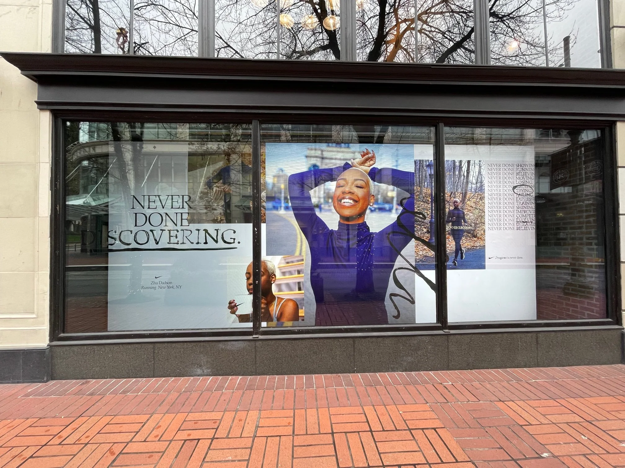 For the 2021 Miami marathon, I had the opportunity to create a store takeover moment to highlight Nike’s running shoes. This included the design of large scale window graphics with cut vinyl, the footprint of the mannequin display, hanging banners, cling graphics for the changing room, shoe display pedestals, and signage. All of these design elements came together to create a cohesive and immersive consumer experience aimed at educating and exiting the consumer about Nike’s running shoes and at supporting digital environments for runners to connect and push themselves further.