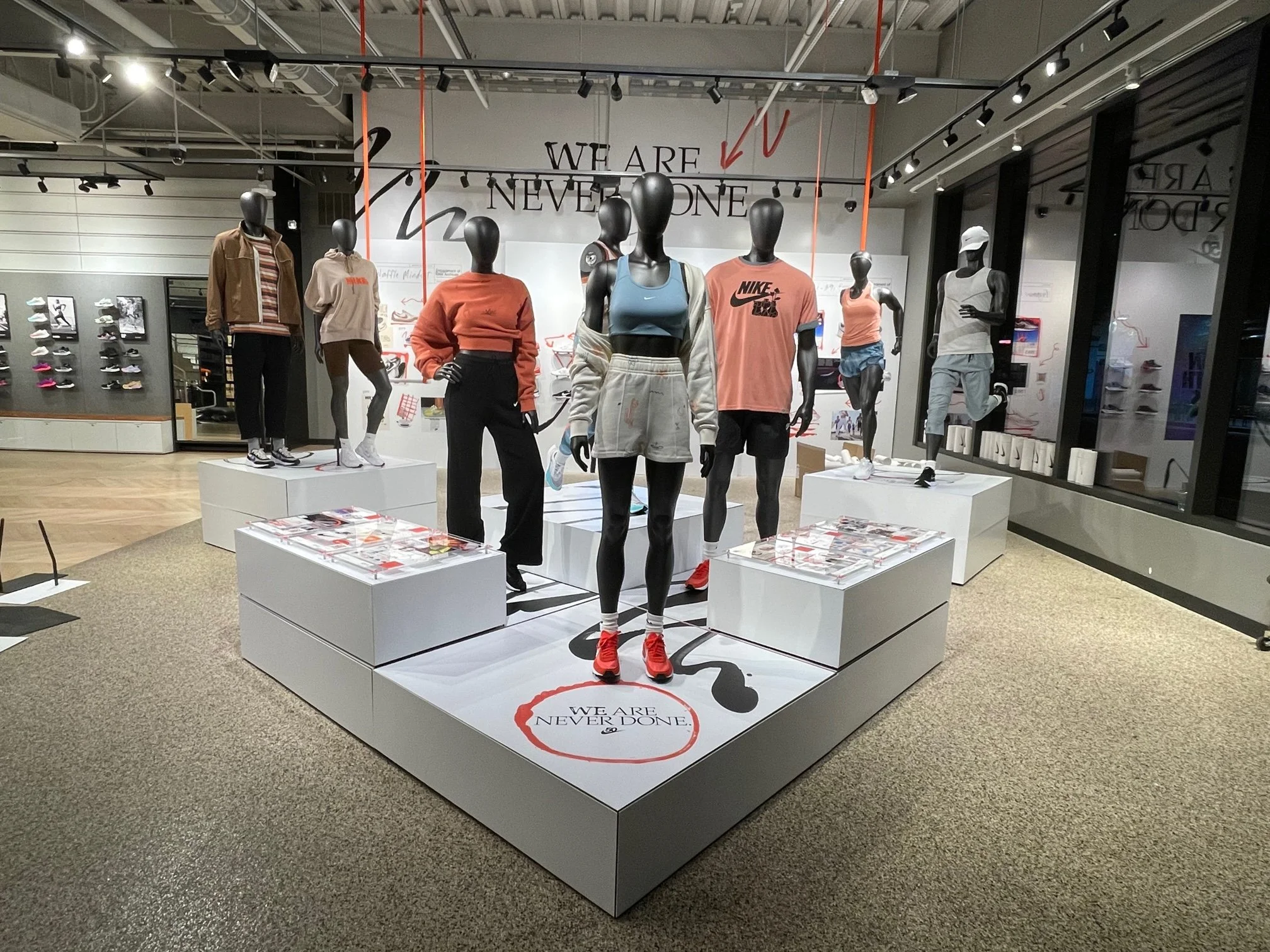 ‘Never Done’ was a SP22 initiative by Nike to highlight new product and a new graphic style and campaign. The scope of work included window treatments, custom and templated product signage, custom campaign signage, large scale wall graphics, custom mannequin displays, and custom shoe displays, across 18 locations in the US market.